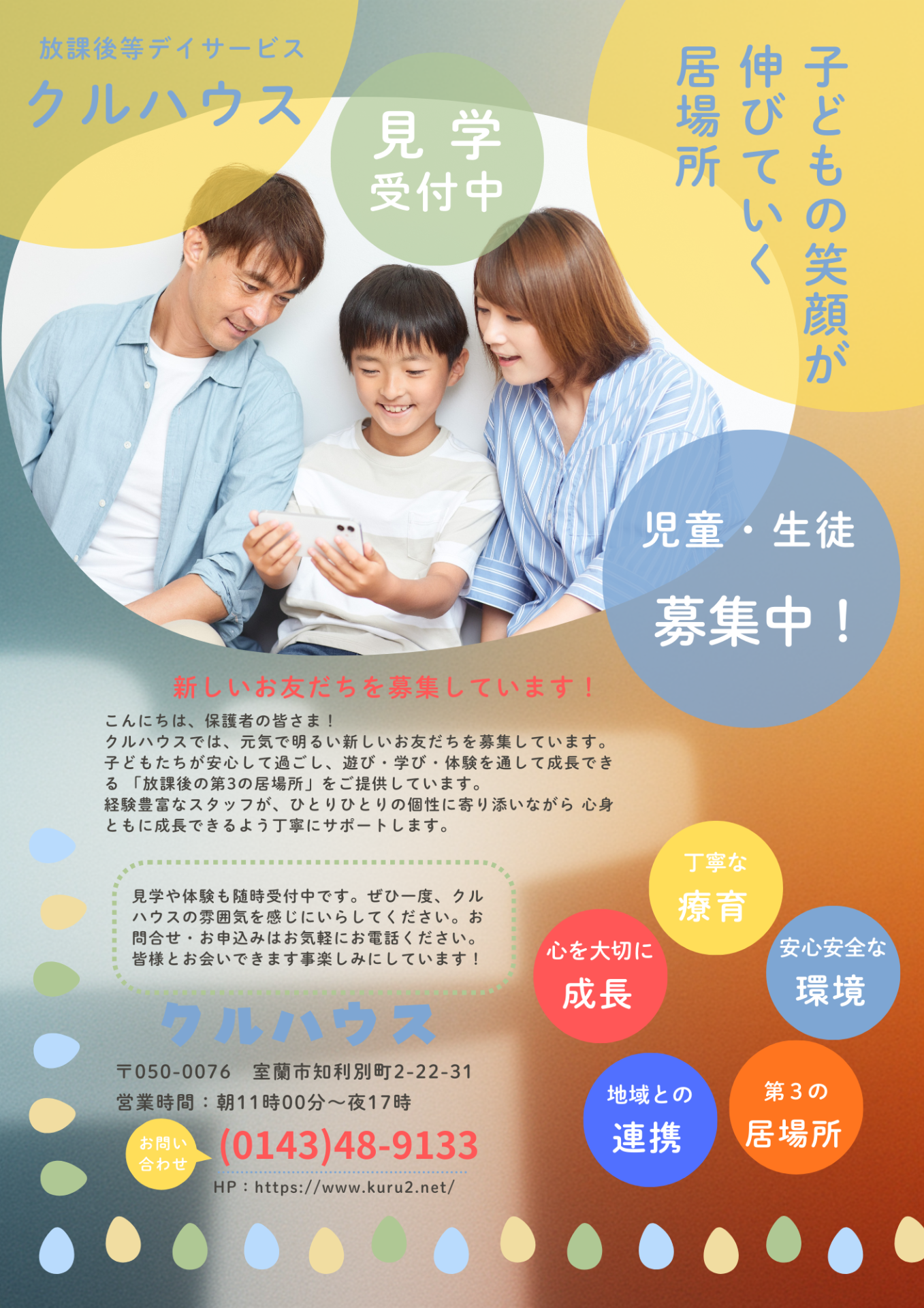 障がいを持つ子どもたちが安心して過ごせる場所を提供し、学習や生活支援を通じて自立した未来をサポートする場です。クルハウスでは、放課後や学校休業日に、個々のニーズに合わせた個別支援を行い、パソコンを使った学習サポートや、遊びの活動を通じたコミュニケーション能力の向上を目指しています。さらに、保護者との連携も大切にしており、子どもたちの成長を見守りながら、家族全体の生活を支援しています。年間250日以上のサービス提供を行っており、安定したサポートを通じて、子どもたちが自信を持って社会に向かう準備ができるよう取り組んでいます。地域社会とのつながりを深めることで、子どもたちが将来に向けて必要なスキルと心の成長を得られる環境を整えています。