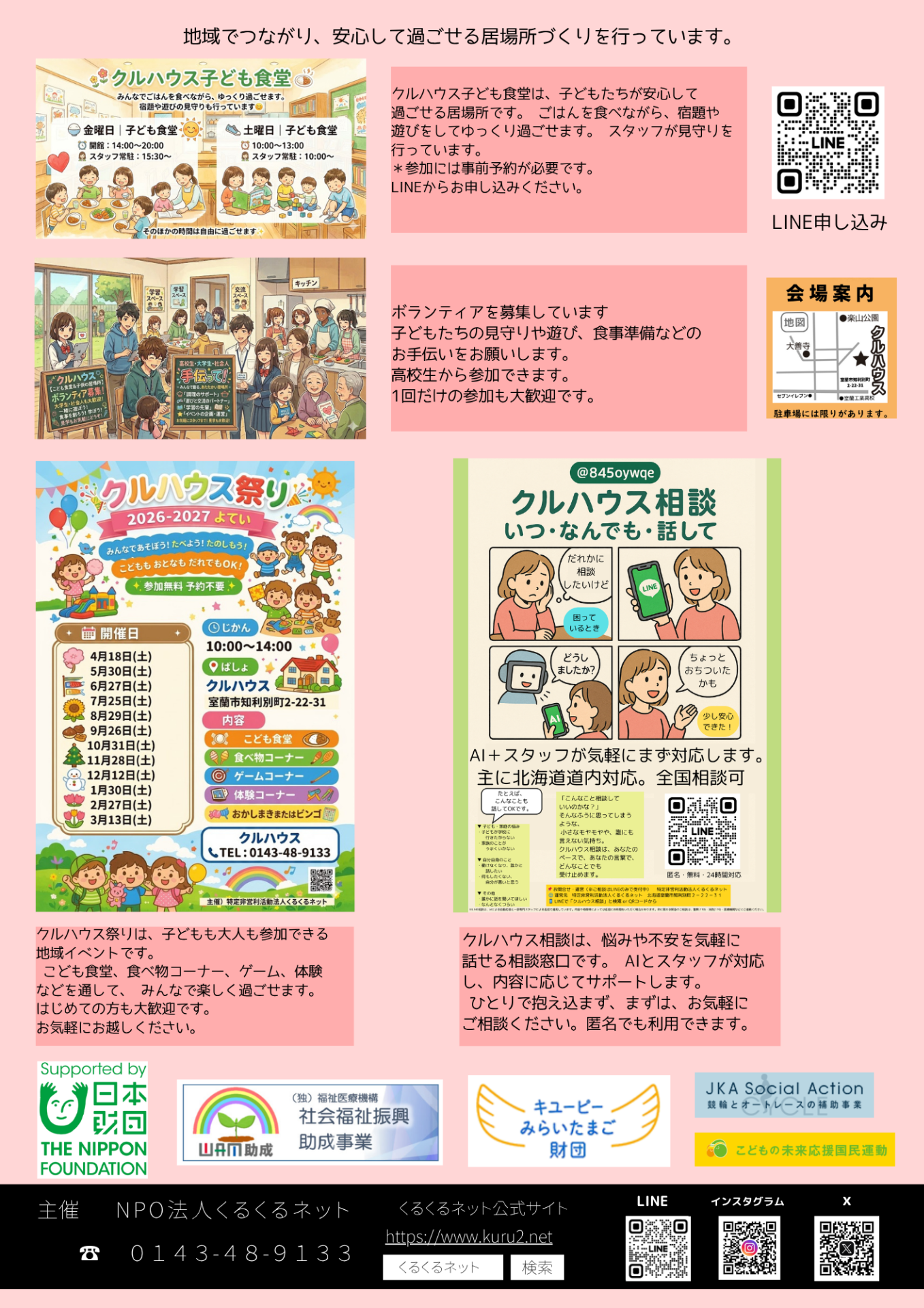 くるくるネットは、2004年に設立されたNPO法人で、北海道室蘭市を中心に活動しています。私たちは、子どもや障がい者、地域住民に対して、学習支援や就労支援、食事支援などの事業を通じて、地域社会の福祉向上を目指しています。特に「居場所づくり」を重視しており、誰もが安心して集える場所を提供しています。